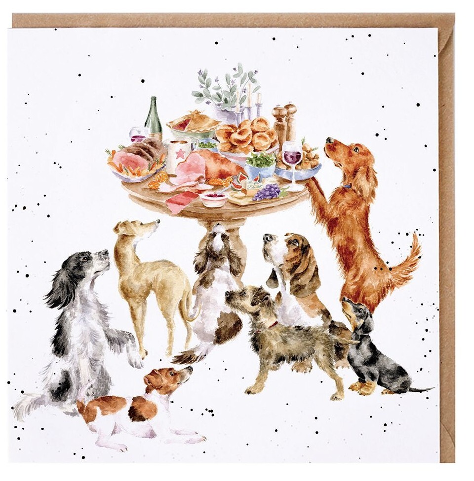 Featuring a lovely scene with dogs around a table of food, this card is perfect for any occasion. The image is printed on high quality, sustainably sourced textured board and is left blank inside for your own message. Supplied with a recycled kraft envelope and measures 15cm x 15cm.