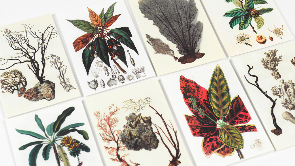 In the 19th century, advances in colour printing helped natural science imagery reach a wider audience through richly illustrated books and journals. Here, depictions of flora and fauna sourced from antique publications have been reproduced on high-quality printed papers.