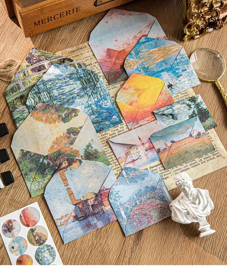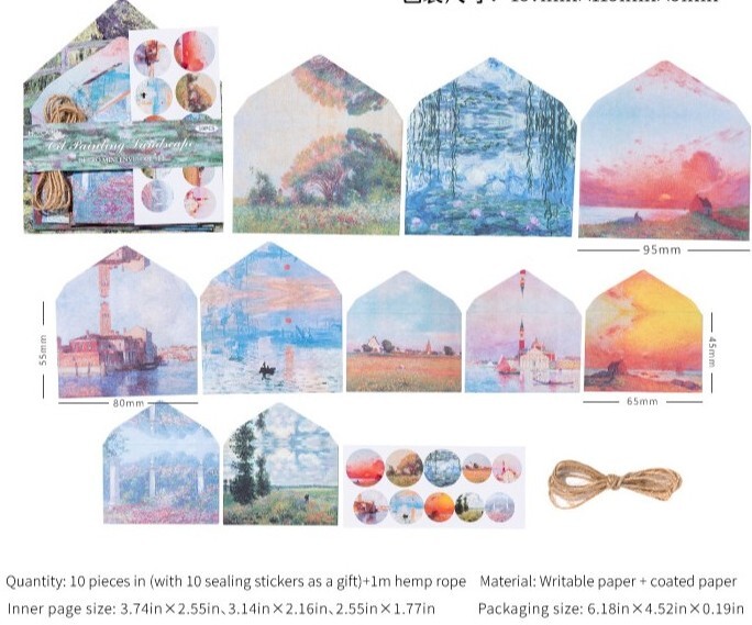 Setje met 10 envelopjes, 10 sluitstickers en stukje touw. Formaat envelopjes: 3 stuks 9,5 x 6,5 cm. 2 stuks 8 x 5,5 cm 5 stuks 6,5 x 4,5 cm