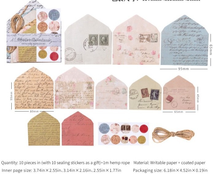 Setje met 10 envelopjes, 10 sluitstickers en stukje touw.