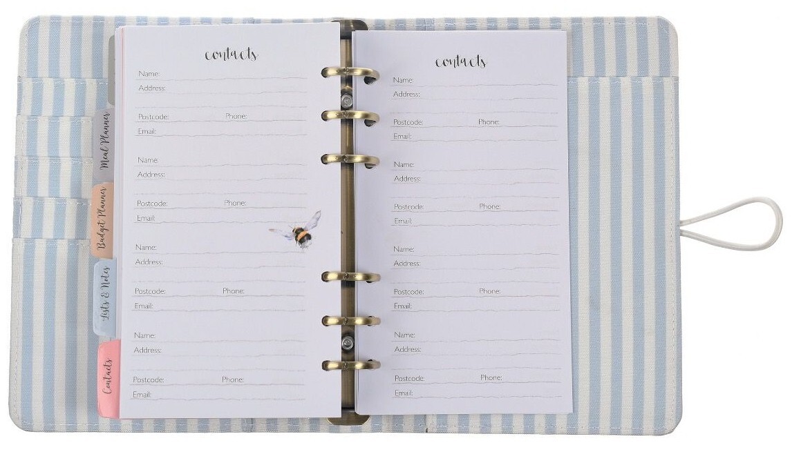 Deze fantastische '' agenda is boordevol handige informatie om elk aspect van je leven te organiseren. De agenda is verdeeld in verschillende secties en bevat pagina's voor een maandplanner, weekplanner, maaltijdplanning, boodschappenlijsten, budgetten, to-do-lijsten, notities, contacten en wachtwoorden. Dankzij het gestructureerde oppervlak kan de agenda worden gesloten met een elastiekje rond een sluiting in de vorm van een winterkoning. De pagina's aan de binnenkant kunnen worden gebruikt en verplaatst met een ringband met zes ringen in een prachtige, geborstelde messing afwerking. De binnenkant heeft een gestreept canvas oppervlak en biedt ruimte voor pasjes en een vakje voor notities of bonnetjes. De plannerpagina's zijn blanco, zodat je zelf de datums kunt invullen en de agenda elk jaar kunt gebruiken.